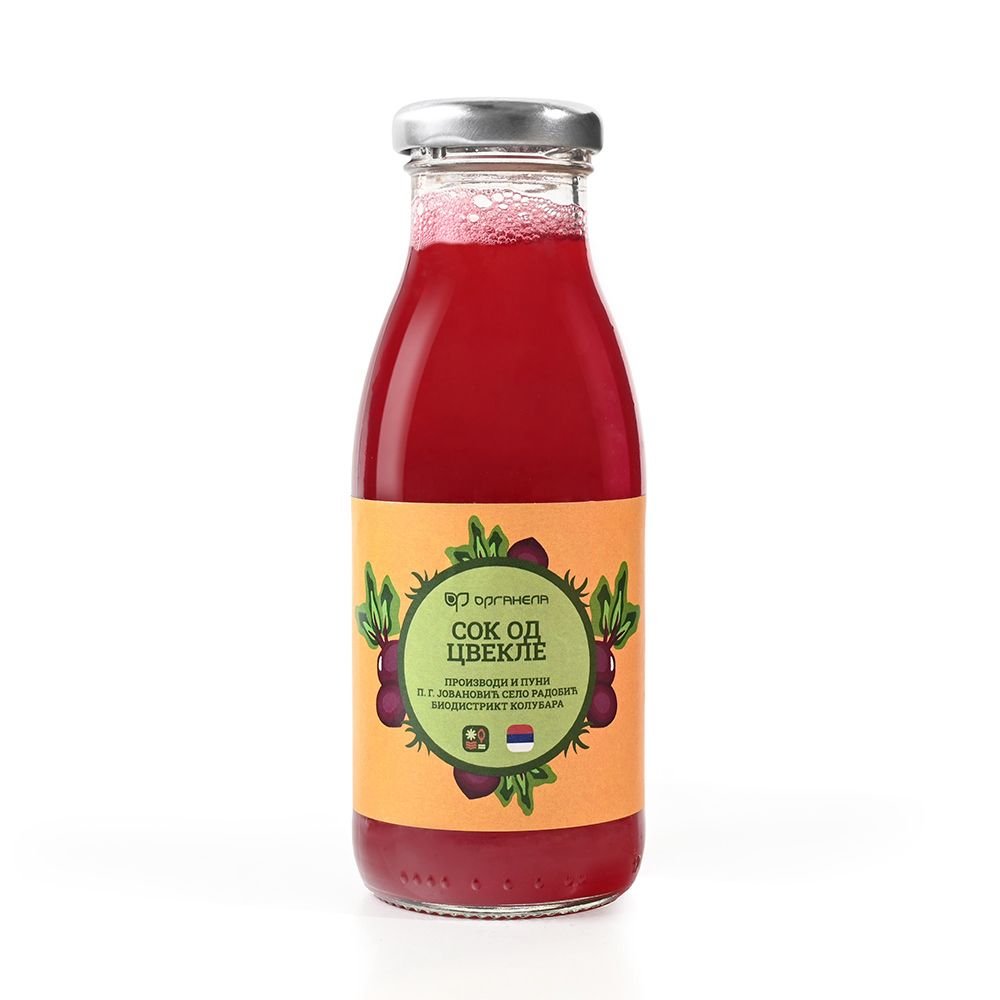 Састав: Хладноцеђени сок од органских јабука (50%), хладноцеђени сок од органске цвекле (50%). Производи: органско газдинство Јовановић, Радобић Производ је пастеризован. Рок трајања: 1 год